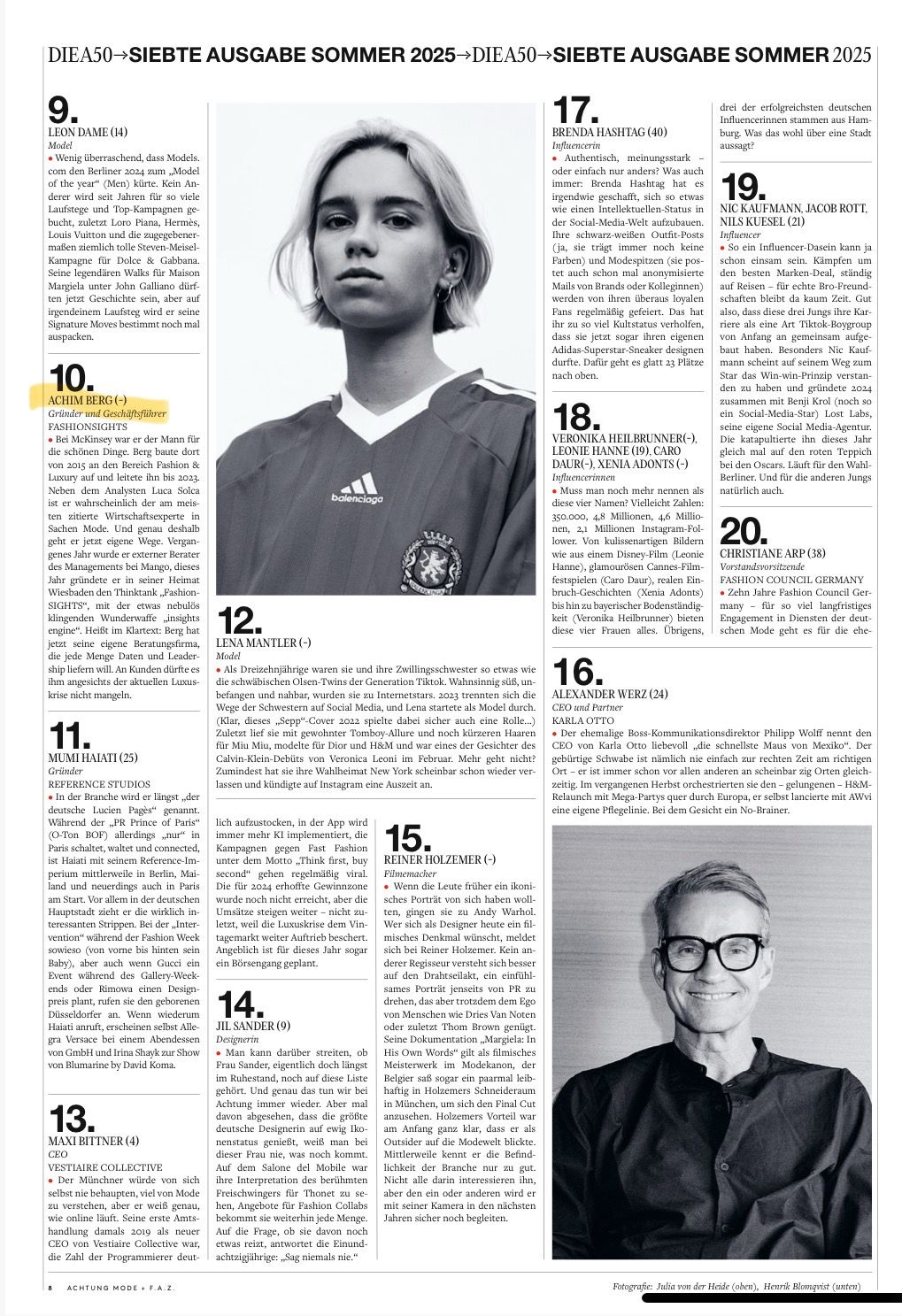 Achtung & FAZ magazine by Alfons Kaiser, Jennifer Wiebking, Markus Ebner, Alex Rottenmanner, Nicole Urbschat, Silke WichertAchim ranks No.10 on Achtung magazine’s annual “A50” list acknowledging his lasting industry influence and founding of FashionSIGHTS.