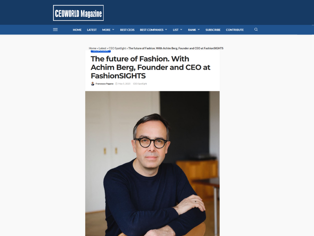 - press May 2025 - The future of FashionCEO World Magazine by Francesco Pagano- Achim Berg reflects on fashion’s future and his mission to reshape it. - He shares his decision to found FashionSIGHTS, an independent think tank dedicated to rigorous research, strategic advisory across the fashion and luxury sectors. Berg praises Giorgio Armani for his timeless integrity and enduring influence while always having stayed true to its nature and seeing him as a benchmark for future generations of designers. He discusses that fashion must blend creativity with digital progress and deeper consumer engagement while preserving its craftsmanship roots. Looking ahead, Berg predicts 2025 will be a transition year, urging brands to reset, rethink, and rebuild amid U.S. market uncertainty.