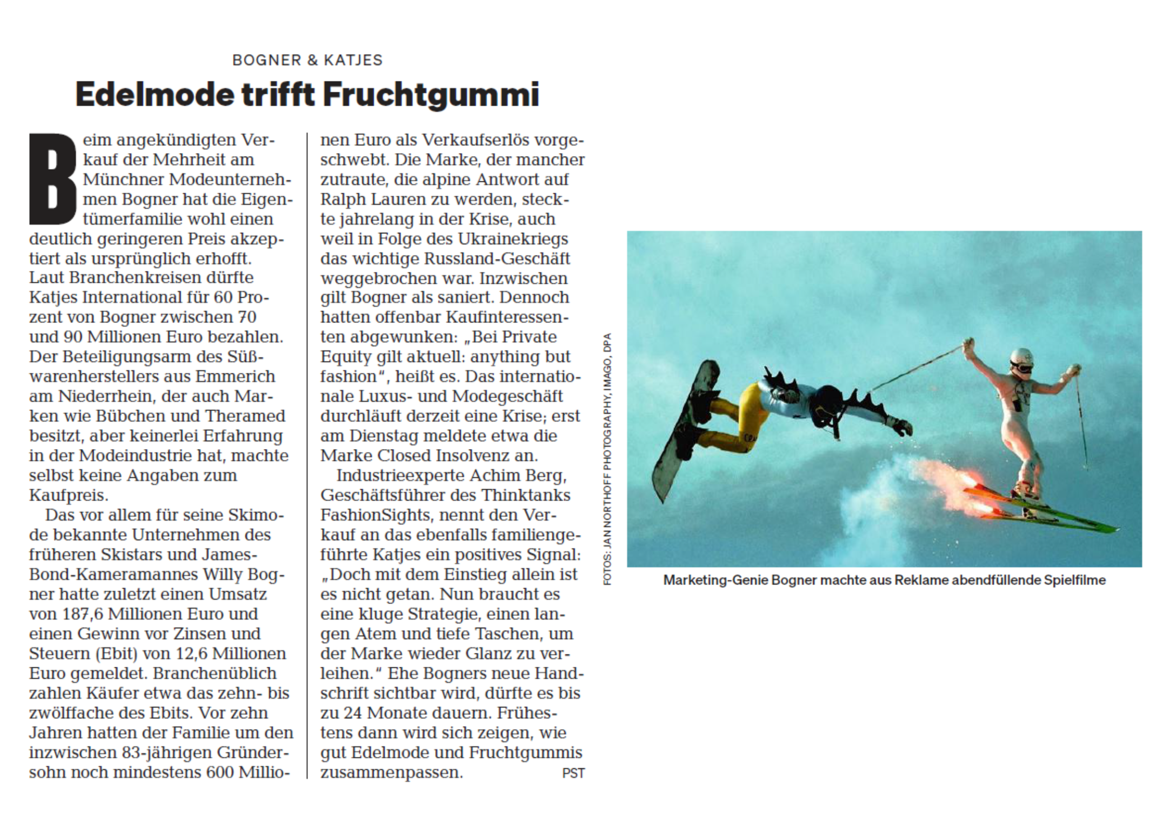- press August 2025 - Edelmode trifft FruchtgummiFOCUS Magazin- Achim comments on Katjes’ acquisition of a majority stake in Munich-based fashion house Bogner. - German confectionery manufacturer Katjes has acquired a 60% stake in premium fashion brand Bogner, previously fully owned by its founding family. Achim views the deal as a positive signal amid today’s challenging fashion and luxury M&A landscape. He further highlights that a long-term strategy, adequate resources, and patience will be key to successfully repositioning and revitalizing the brand.