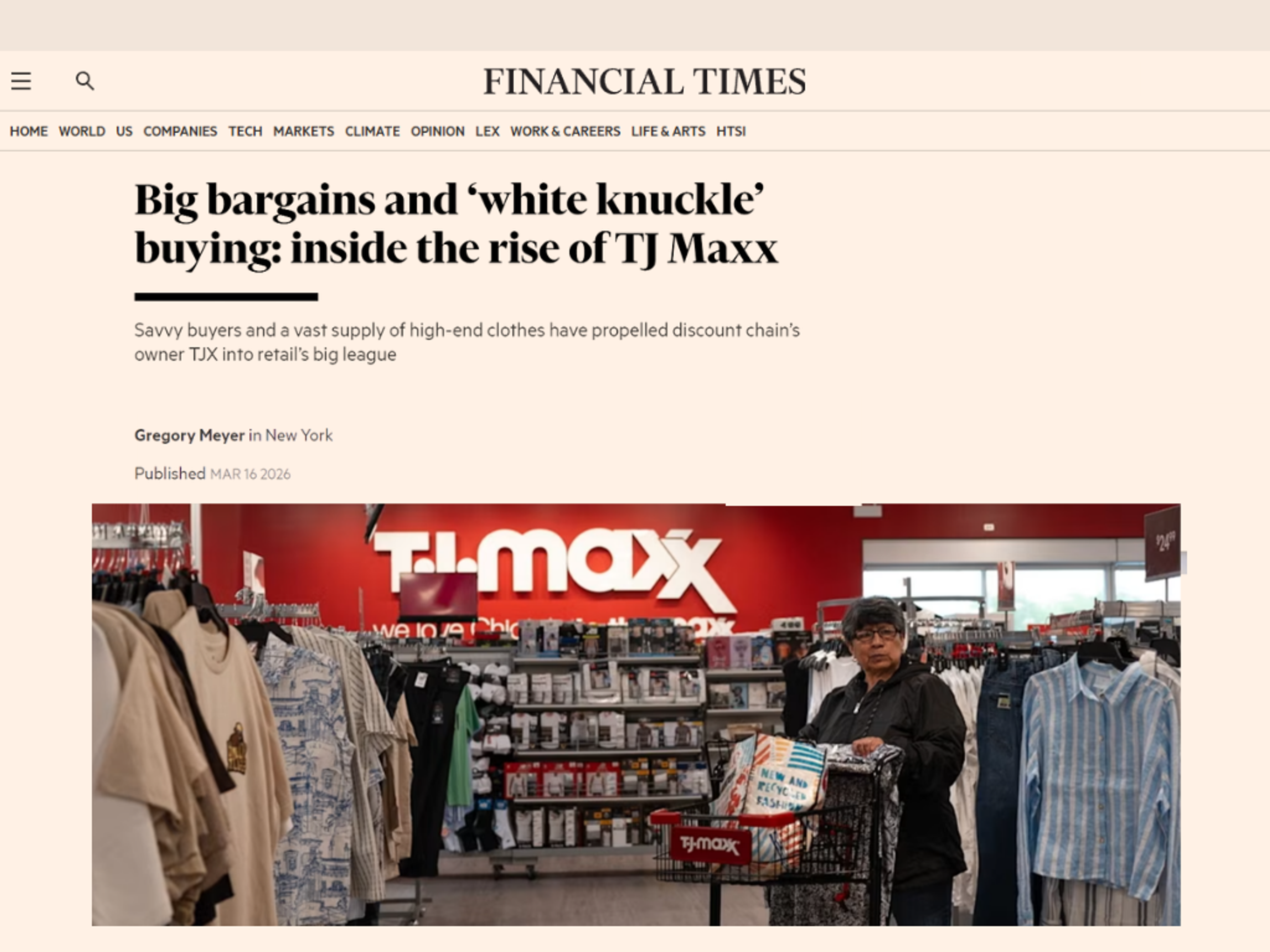 Financial Times by Gregory MeyerAchim comments on the rise of off-price giant TJX and how a perfect storm of consumer pressure and surplus inventory has propelled the discount group into retail's big league.
